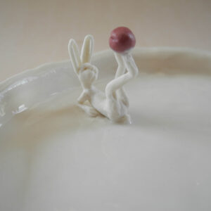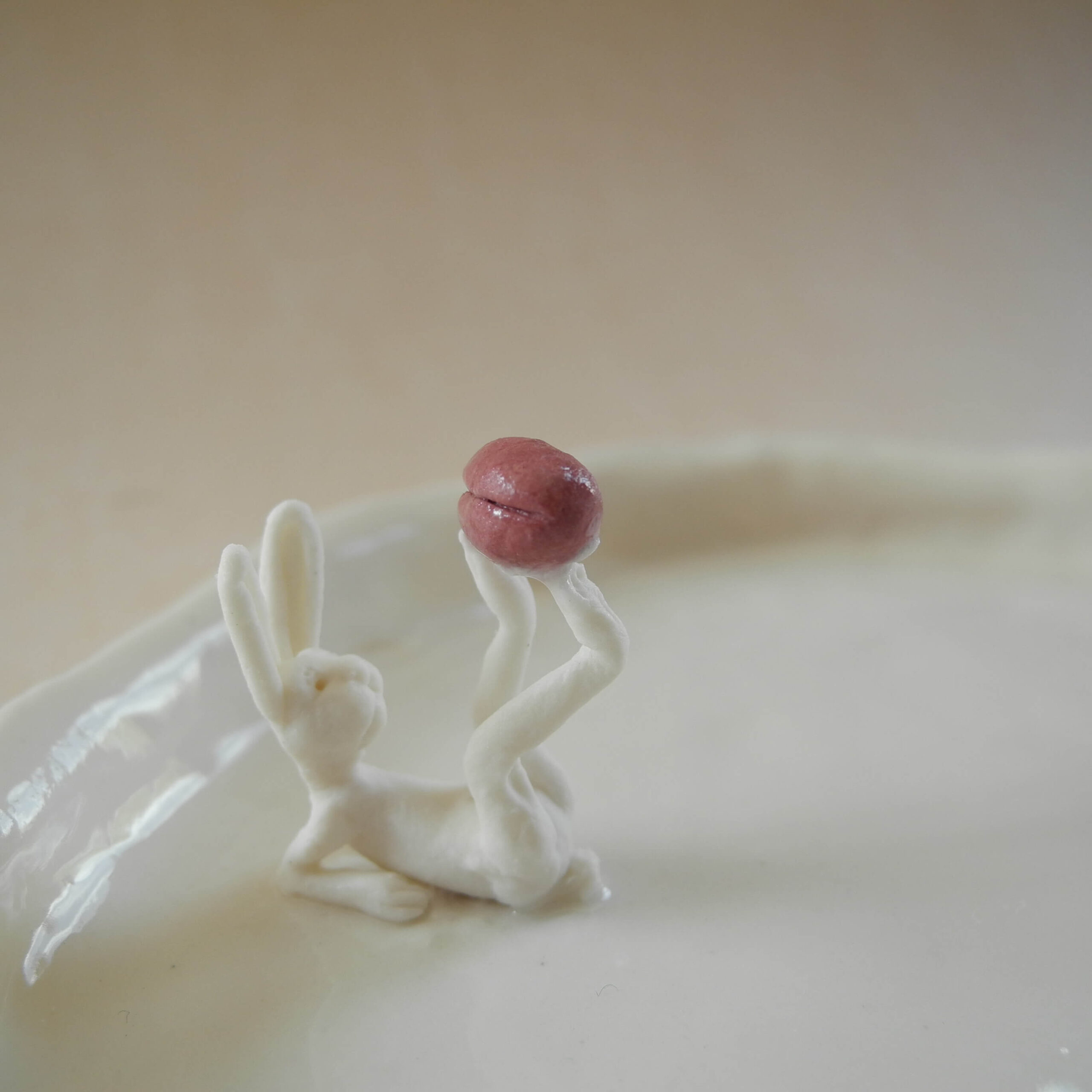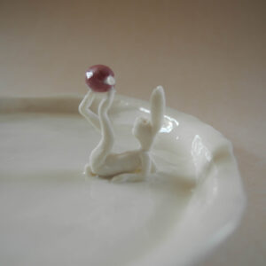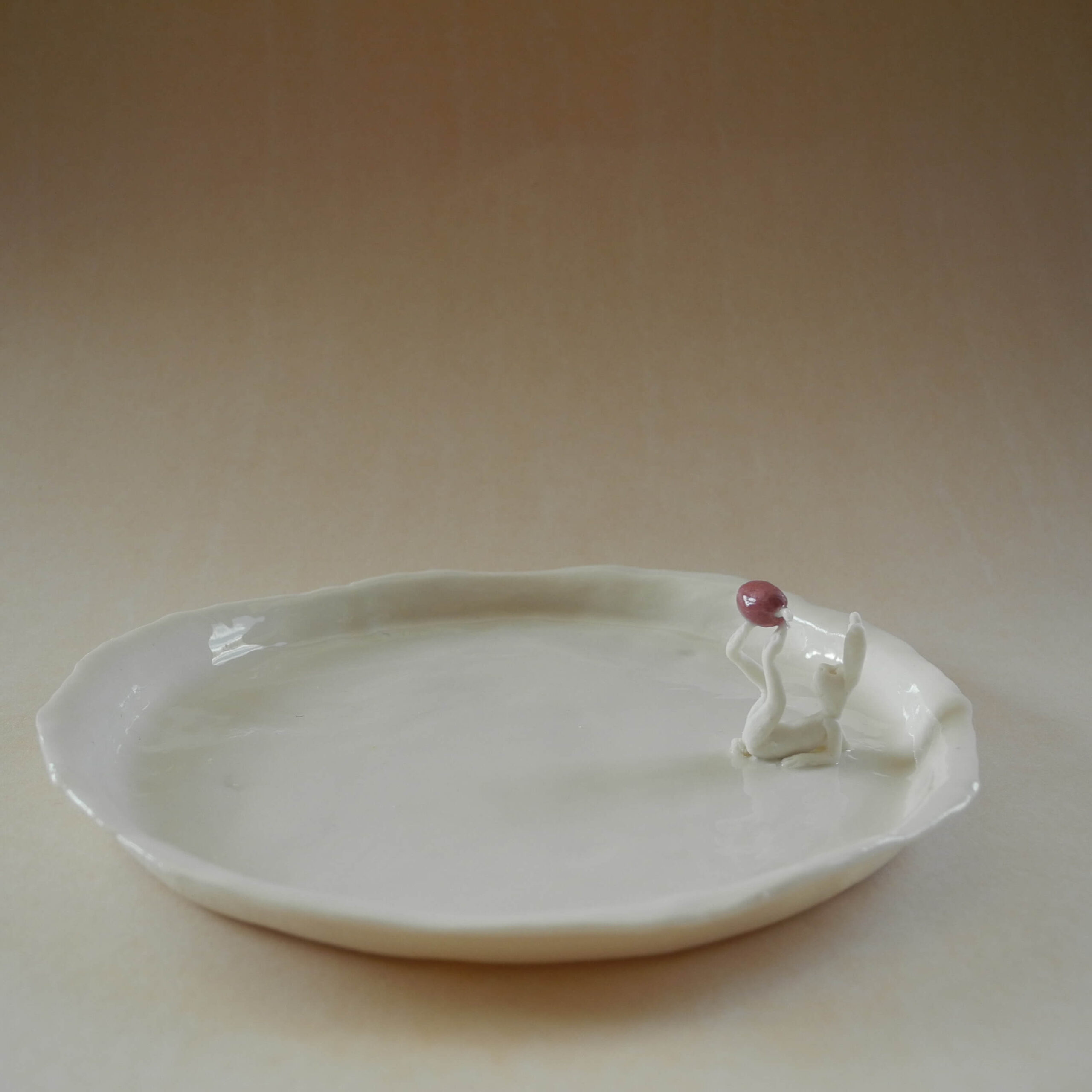 Whimsical oval dish in porcelain as pictured, with a hare balancing a plum on its hind legs. The dish as a bit of a wobble which adds to the balancing act.