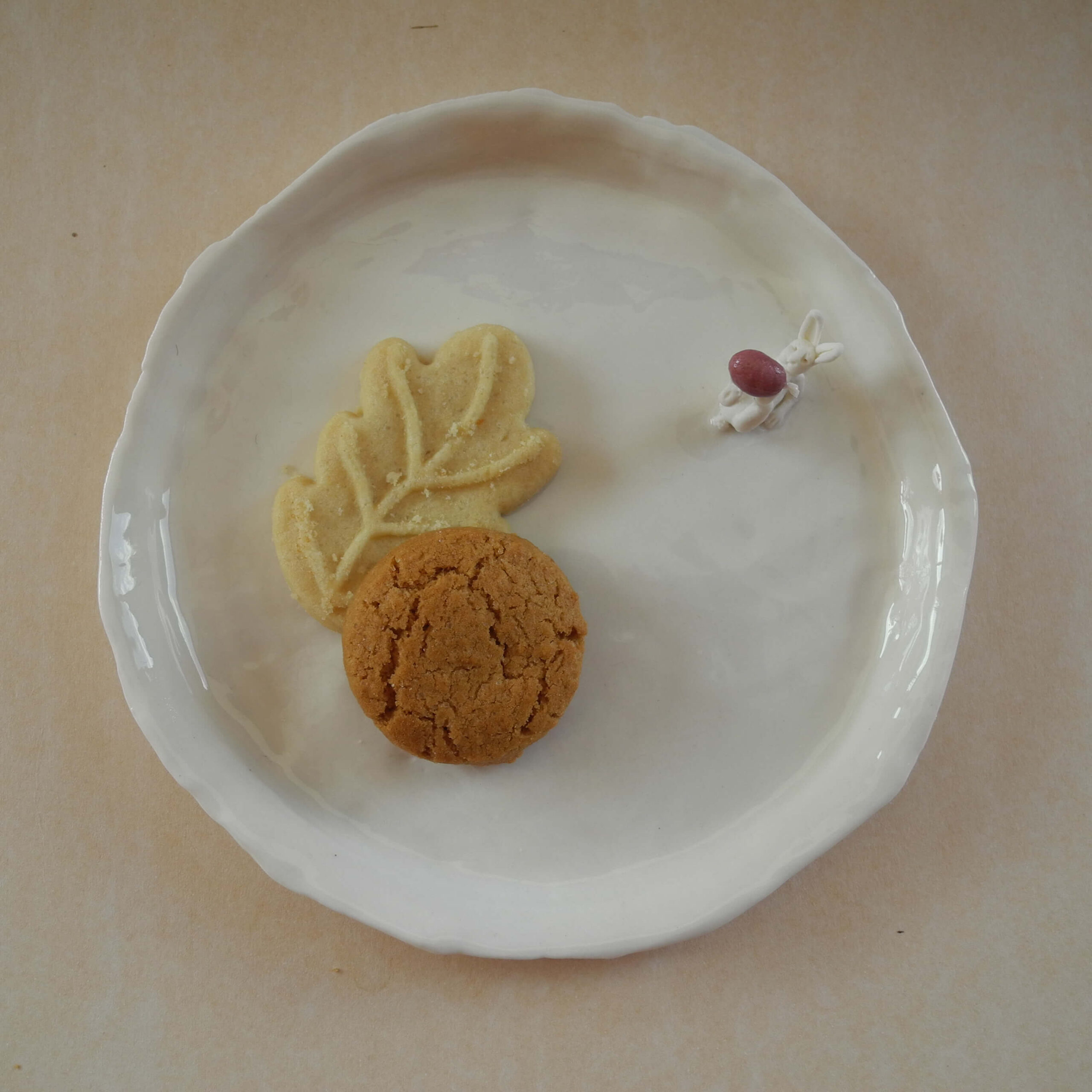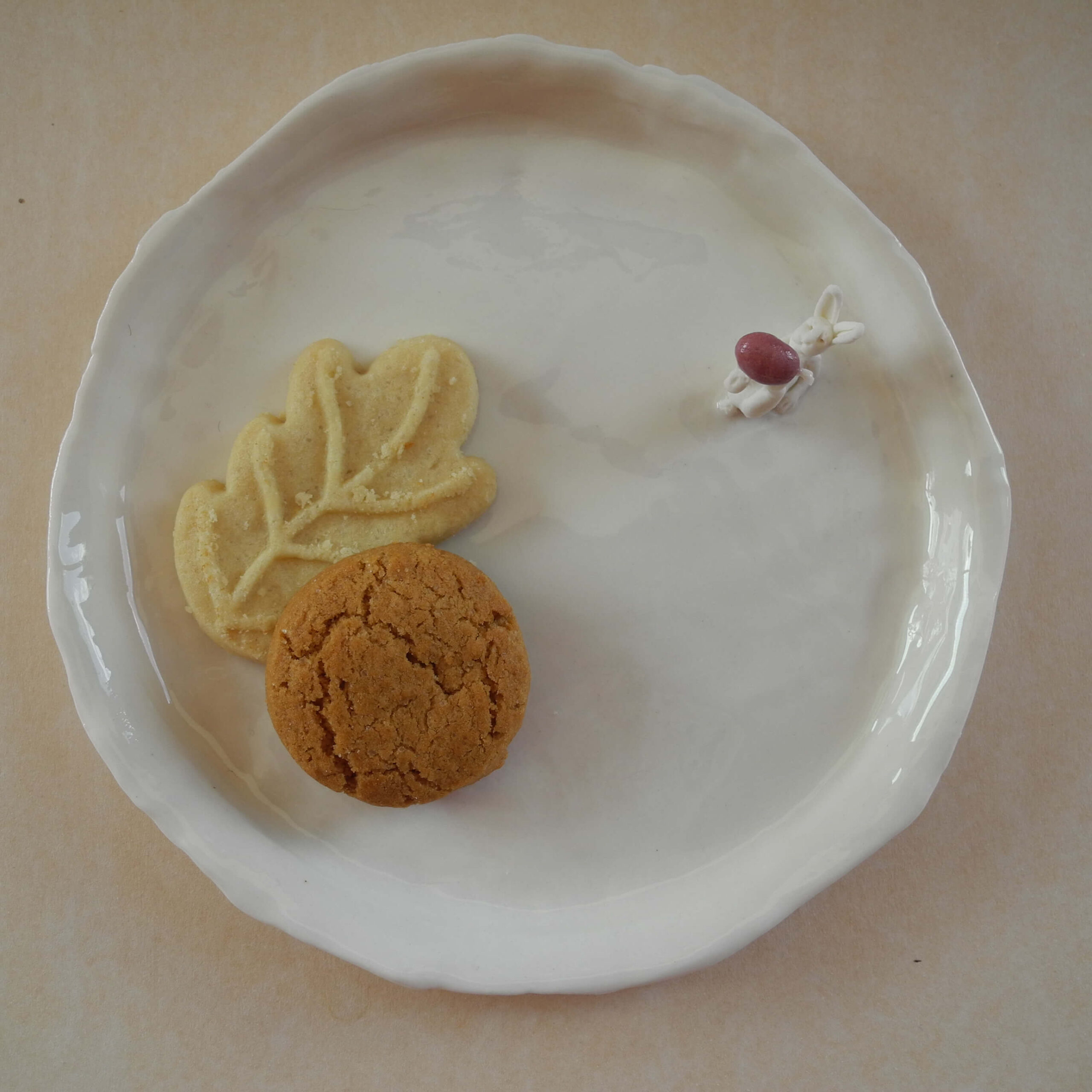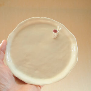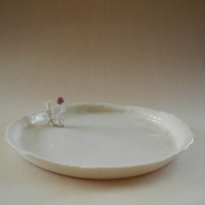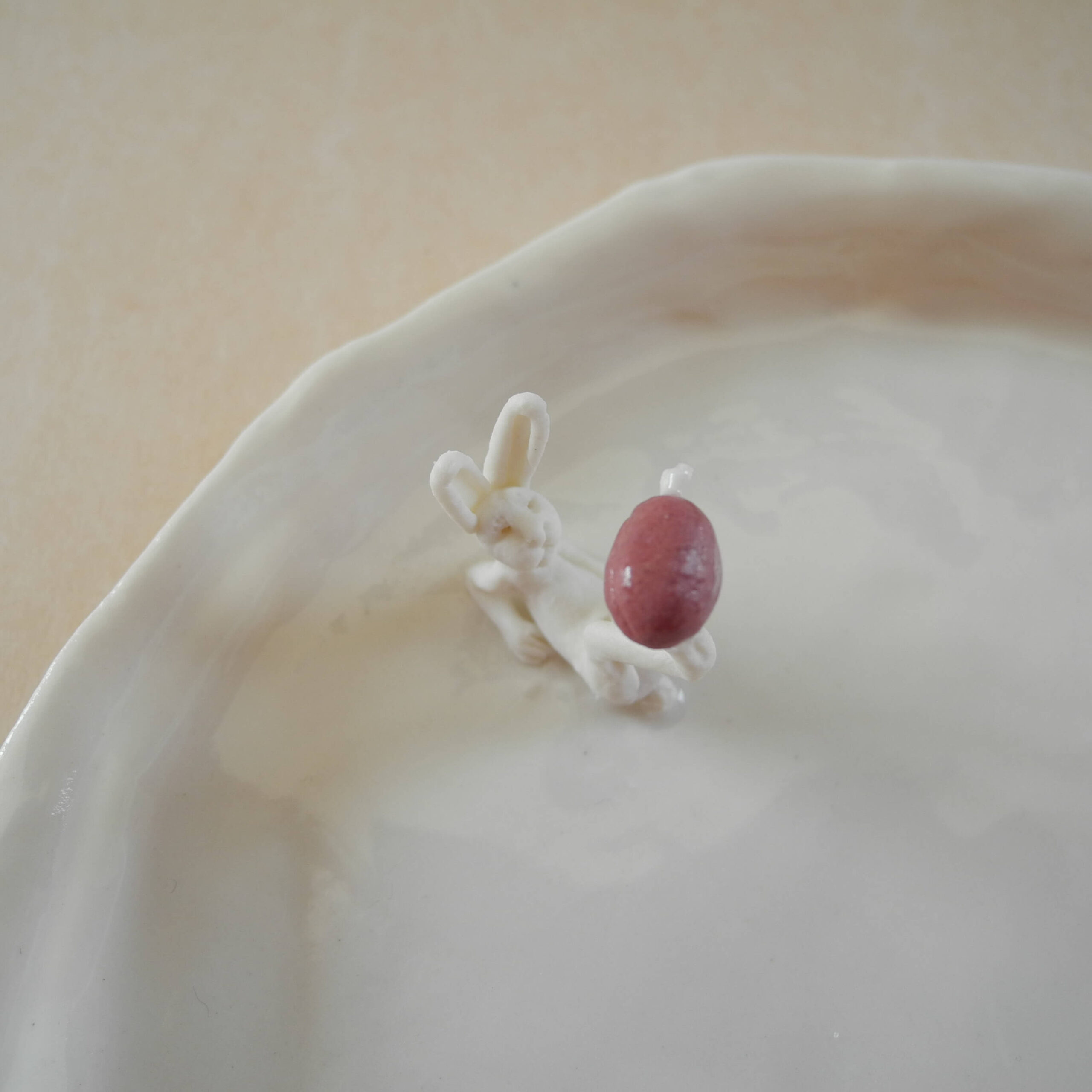 Whimsical oval dish in porcelain as pictured, with a hare balancing a plum on its hind legs. The dish as a bit of a wobble which adds to the balancing act.
