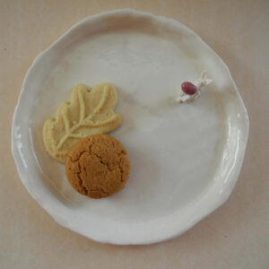 Each piece is handmade by Annemiek Hamelink in porcelain clay. Porcelain clay is different in composition from other clays which makes it stronger. At the same time one can create much thinner items in porcelain; and where it’s thin, it’s translucent, also typical for porcelain. It needs to be fired at a temperature which is higher than average. It’s fired at least twice, once at a low temperature, after which glazes can be applied if need be. The second firing is done at the high temperature were it goes translucent. Natural porcelain is white, but one can add pigments or stains to the clay to give it other colours, the colour is then throughout. When a glaze is applied, it is only on the surface.
