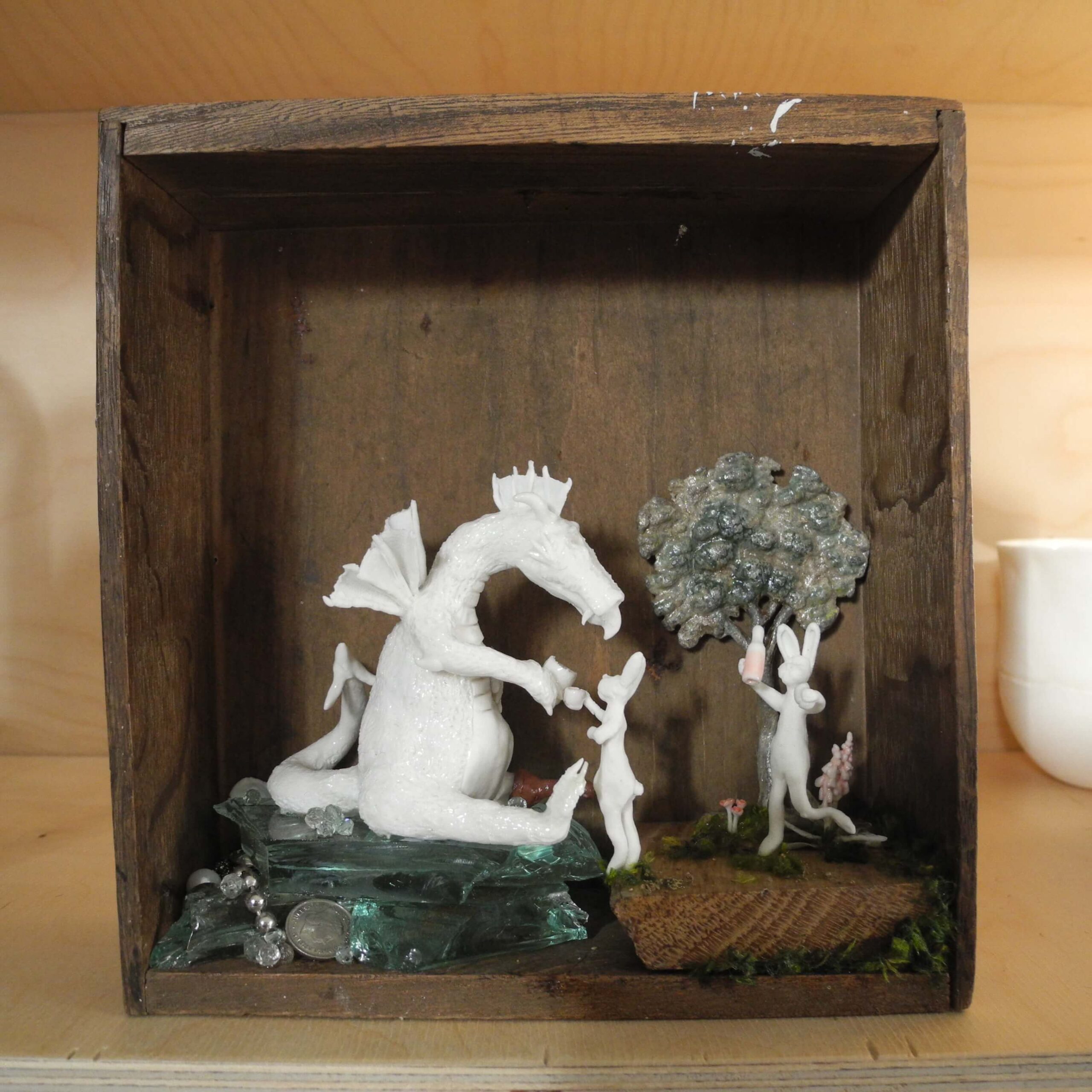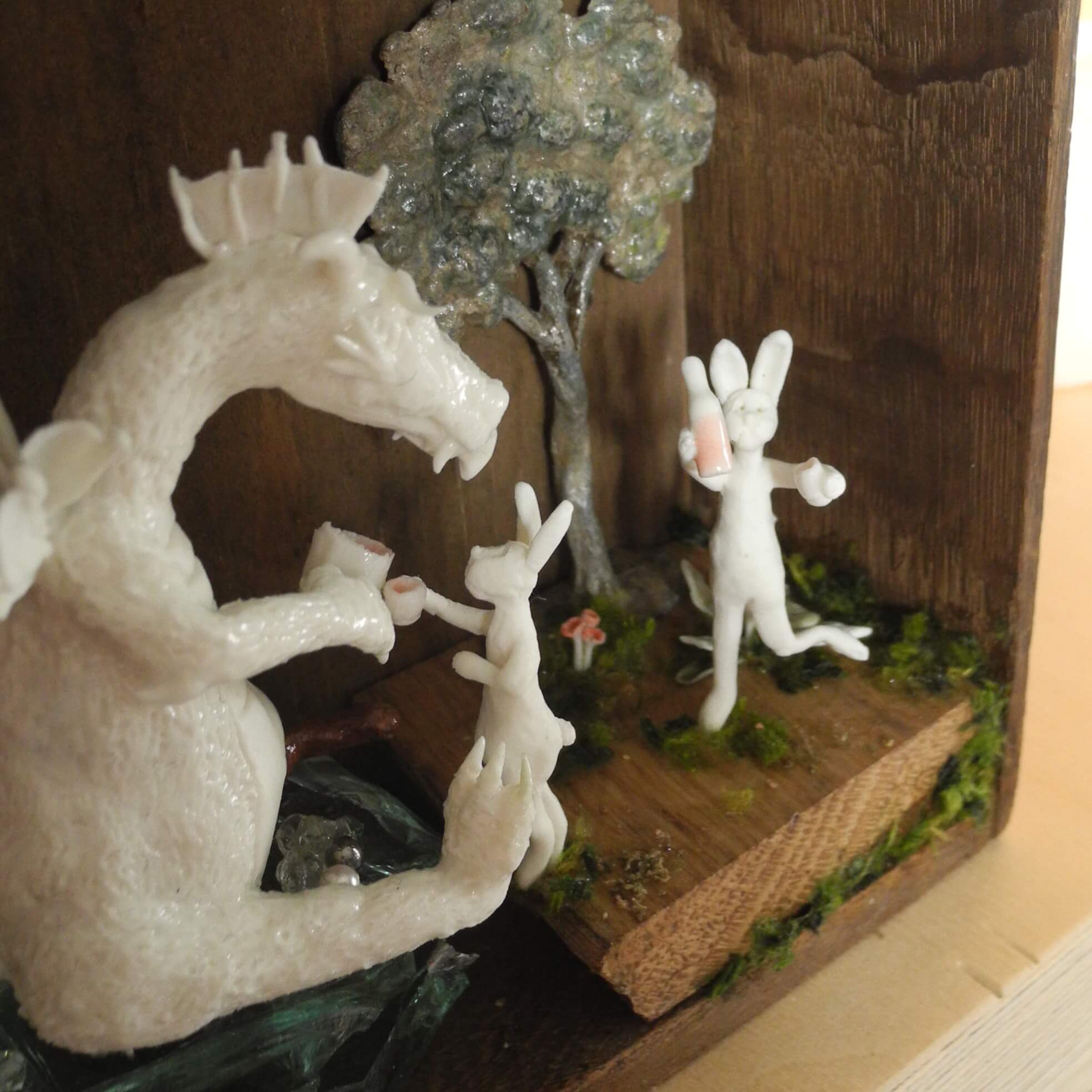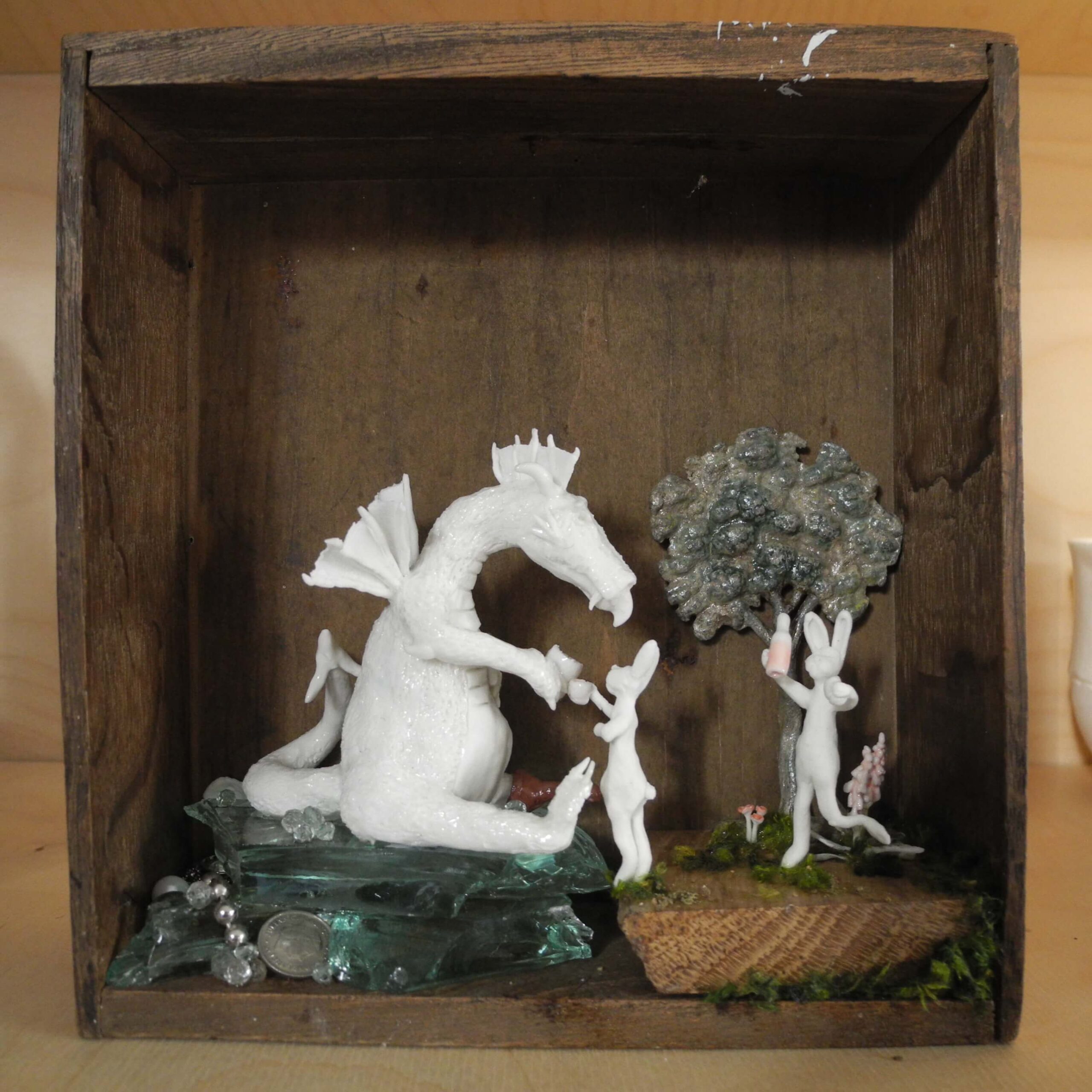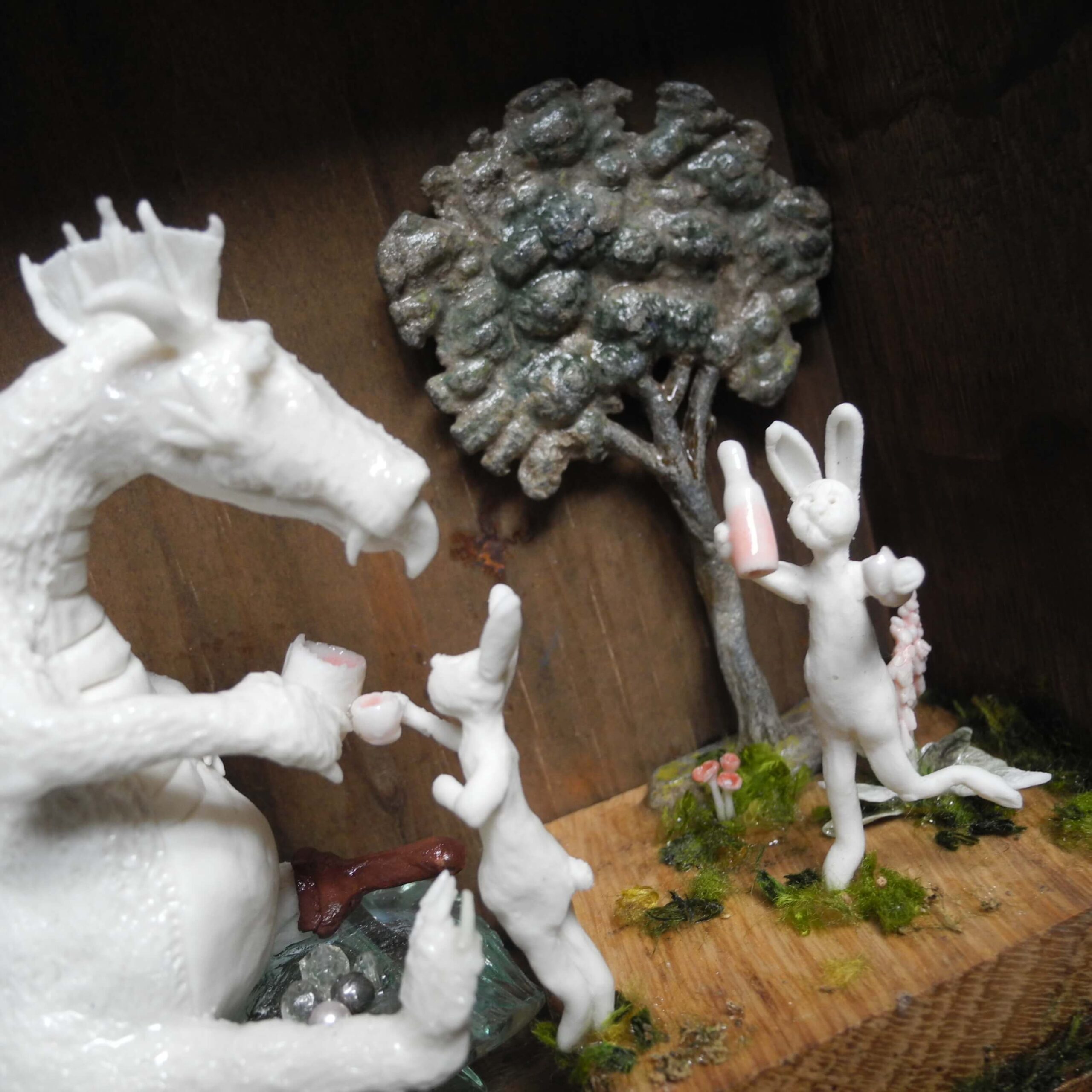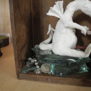 Mixed media piece. In an old solid wood drawer sits a white dragon with a peg leg, don’t ask why or how … Two hares have brought there homemade bottle of goodness and are toasting with the dragon. The white dragon sits on a pile of glass, silvery and pearly items. Among which a “dubbeltje”, a old 10 Dutch cents coin. White dragons are not interested in gold, they hoard everything white, clear or silver coloured. In the background a tree, in lead, protected by a layer of varnish, found when digging in my backyard. Some foxgloves and tulips in porcelain make the scene complete.