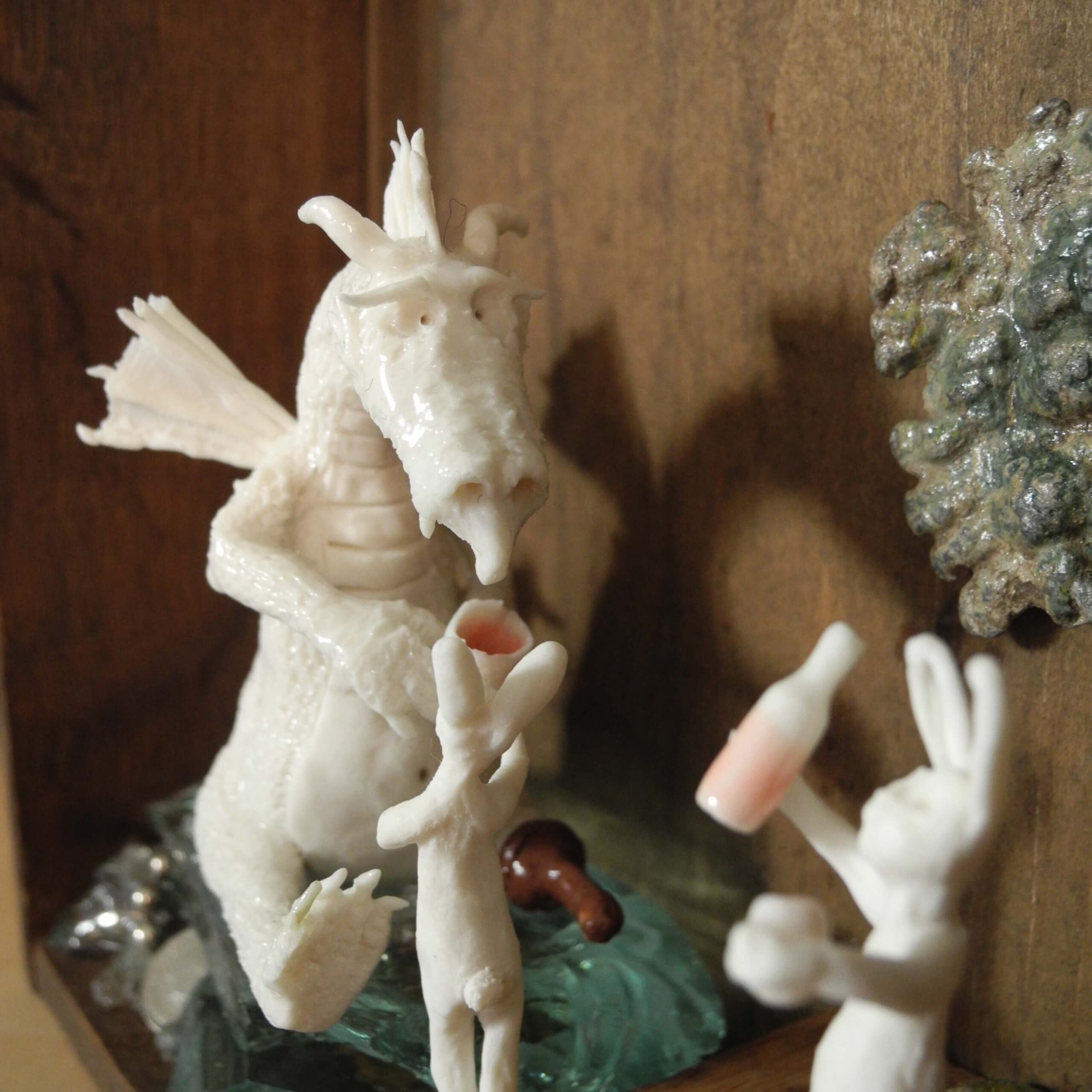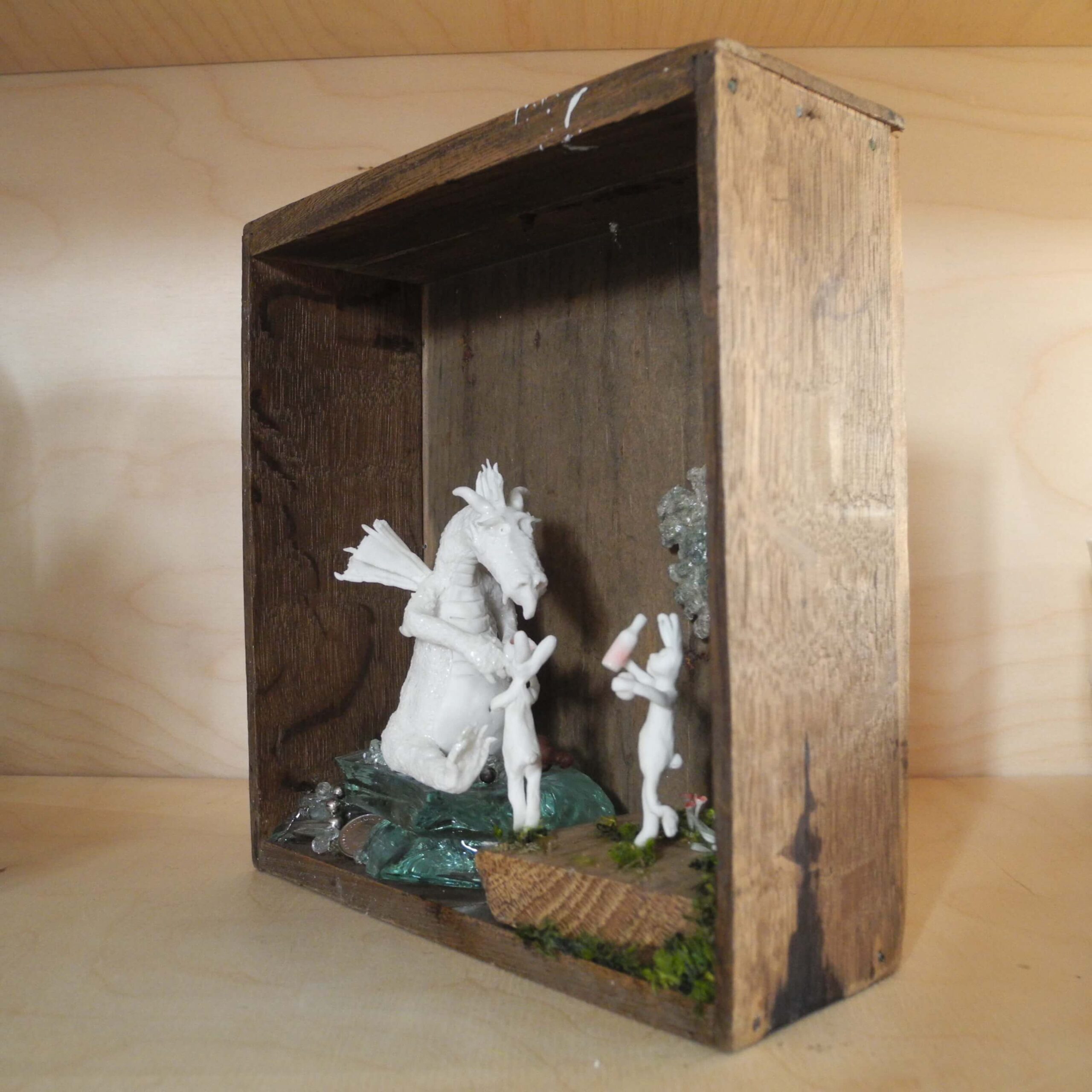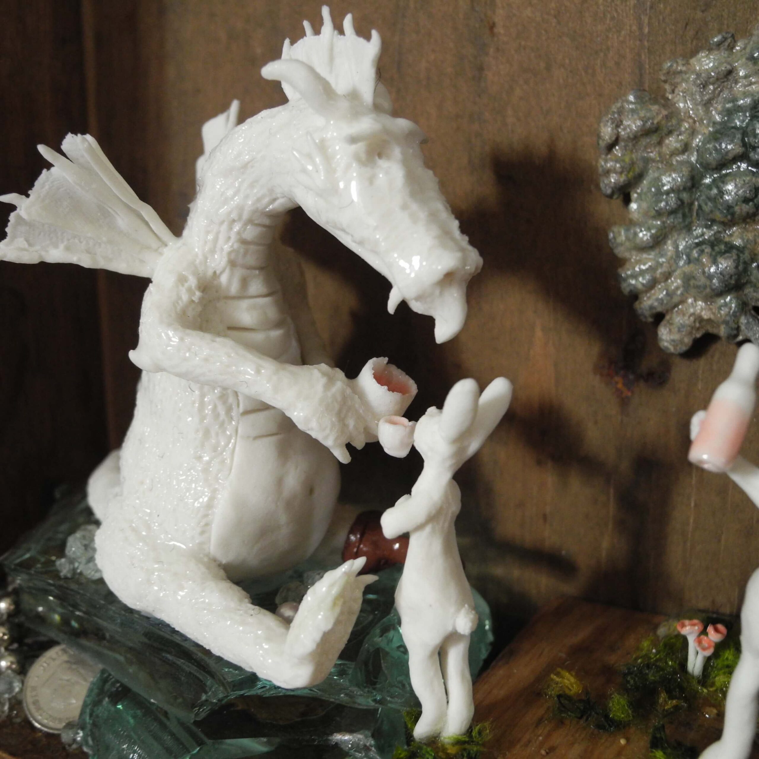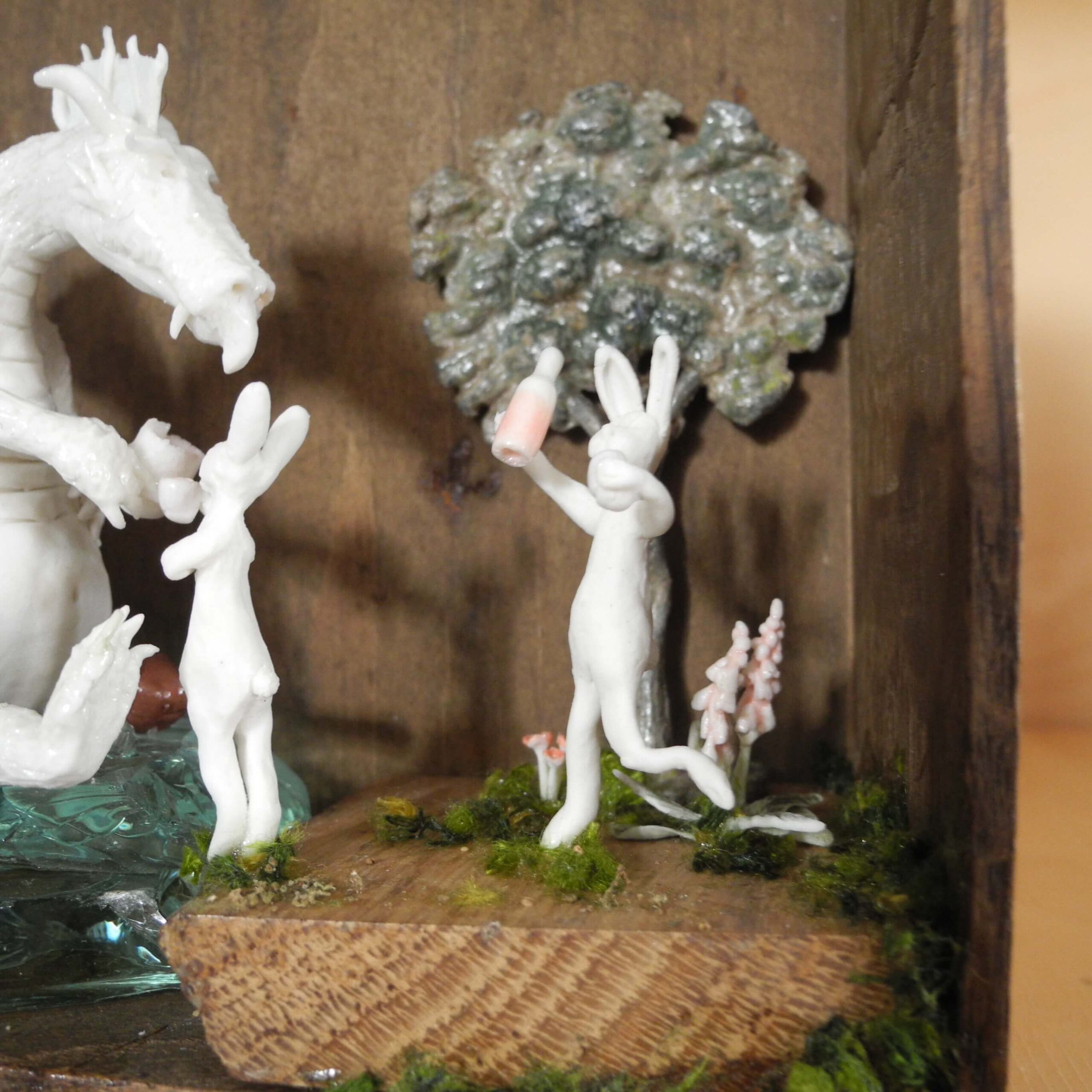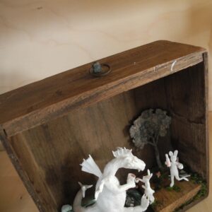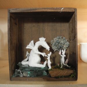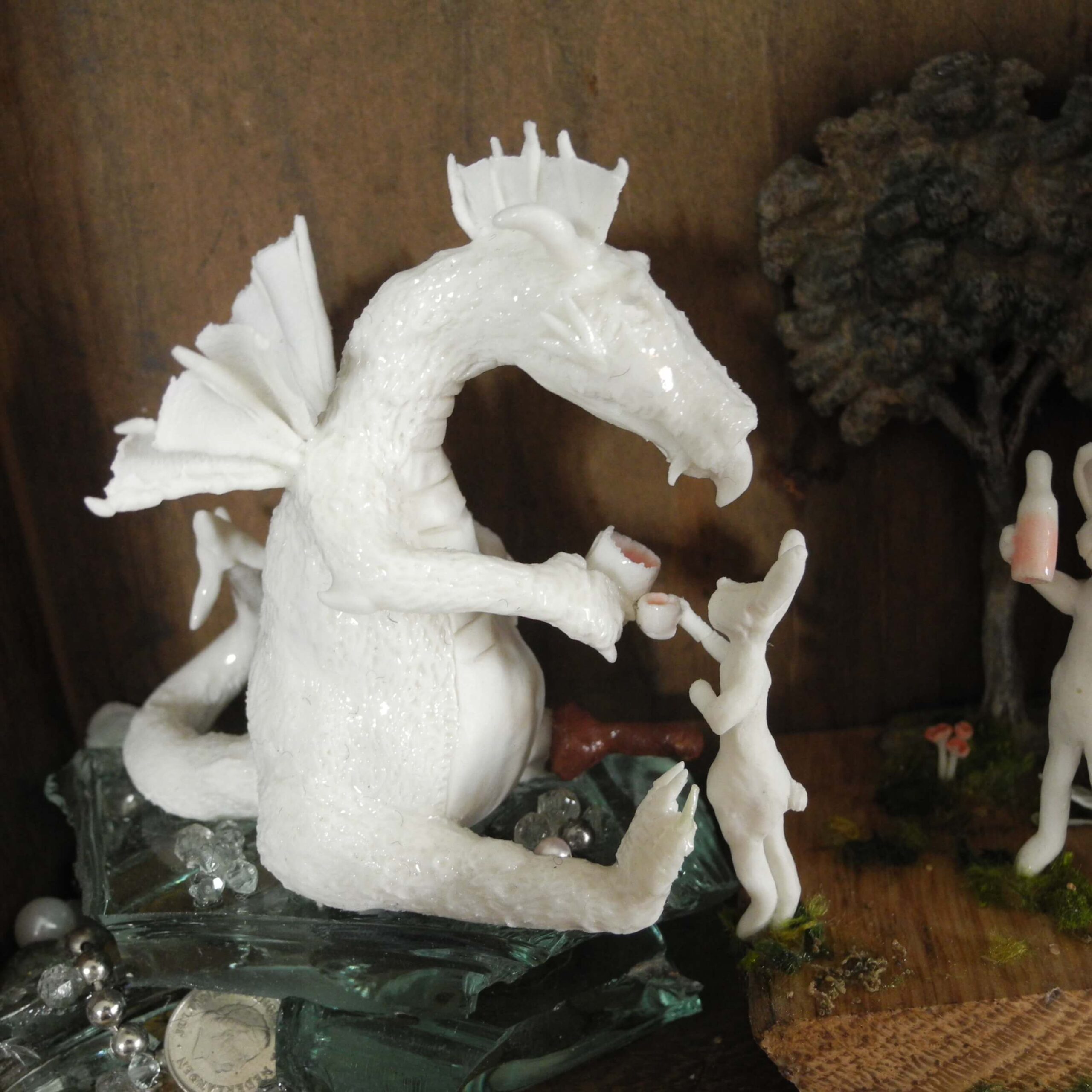 Mixed media piece. In an old solid wood drawer sits a white dragon with a peg leg, don’t ask why or how … Two hares have brought there homemade bottle of goodness and are toasting with the dragon. The white dragon sits on a pile of glass, silvery and pearly items. Among which a “dubbeltje”, a old 10 Dutch cents coin. White dragons are not interested in gold, they hoard everything white, clear or silver coloured. In the background a tree, in lead, protected by a layer of varnish, found when digging in my backyard. Some foxgloves and tulips in porcelain make the scene complete.