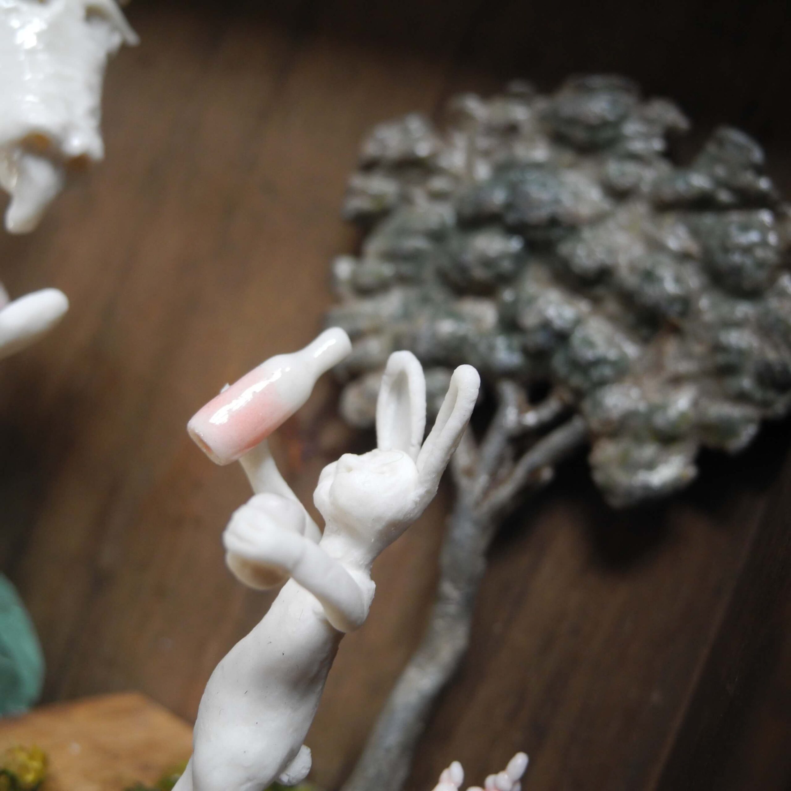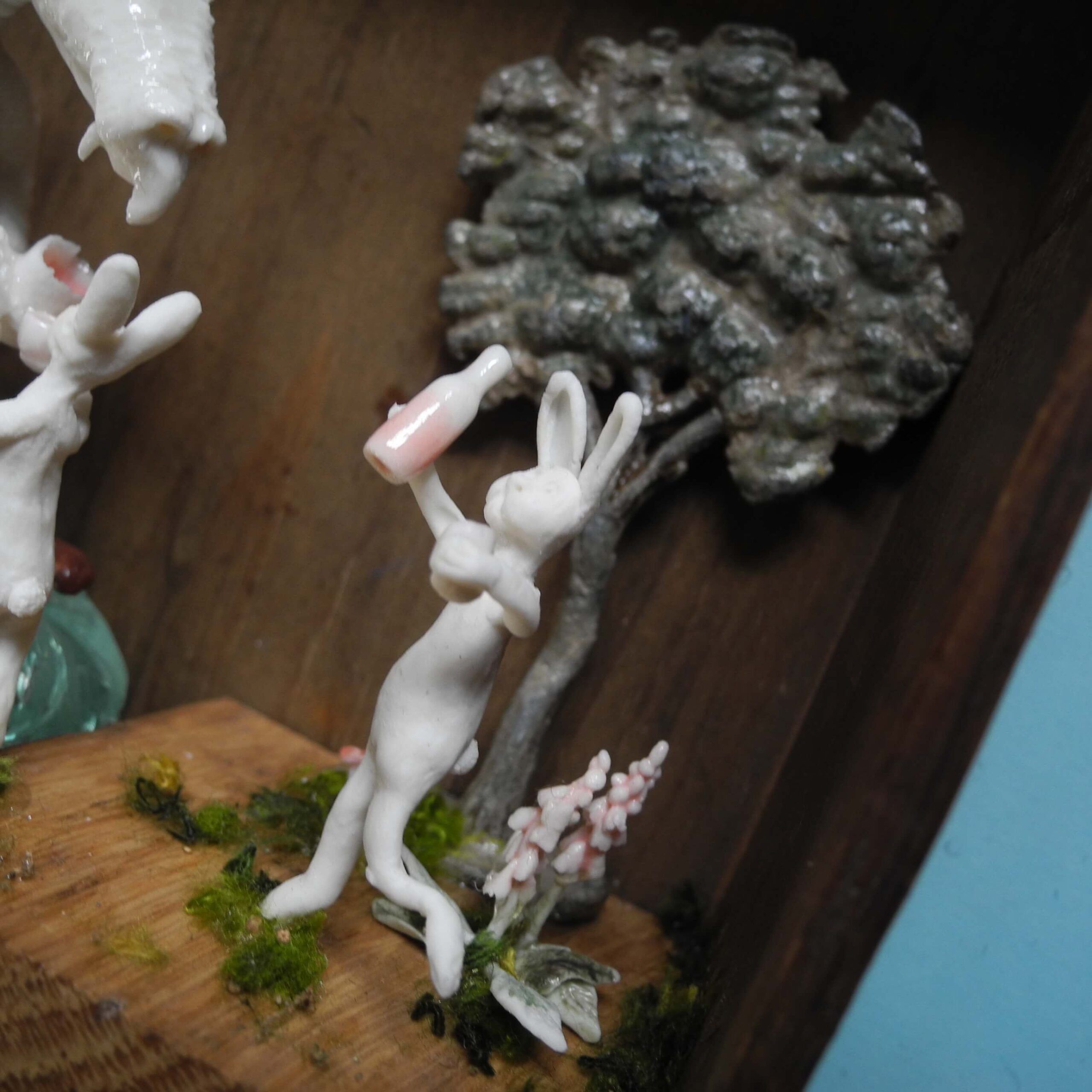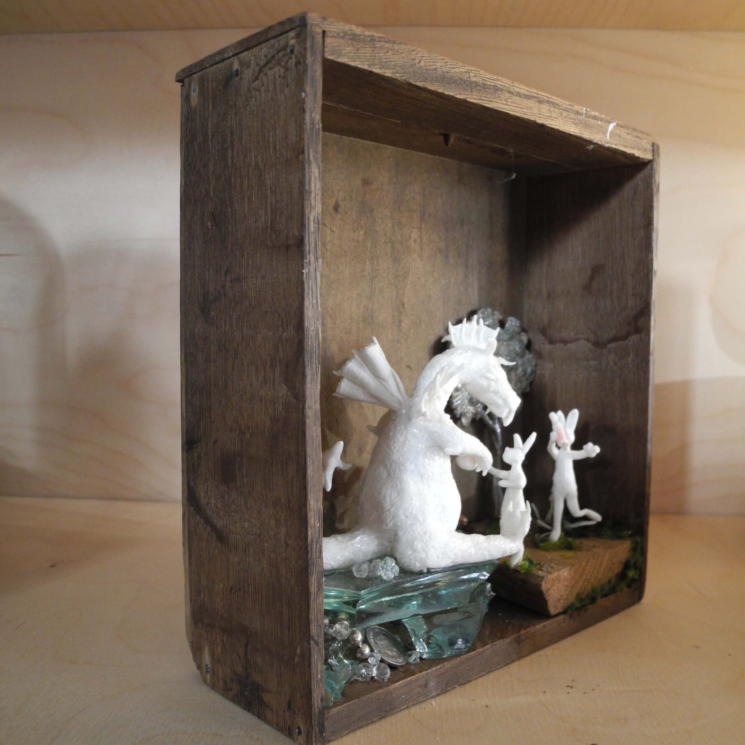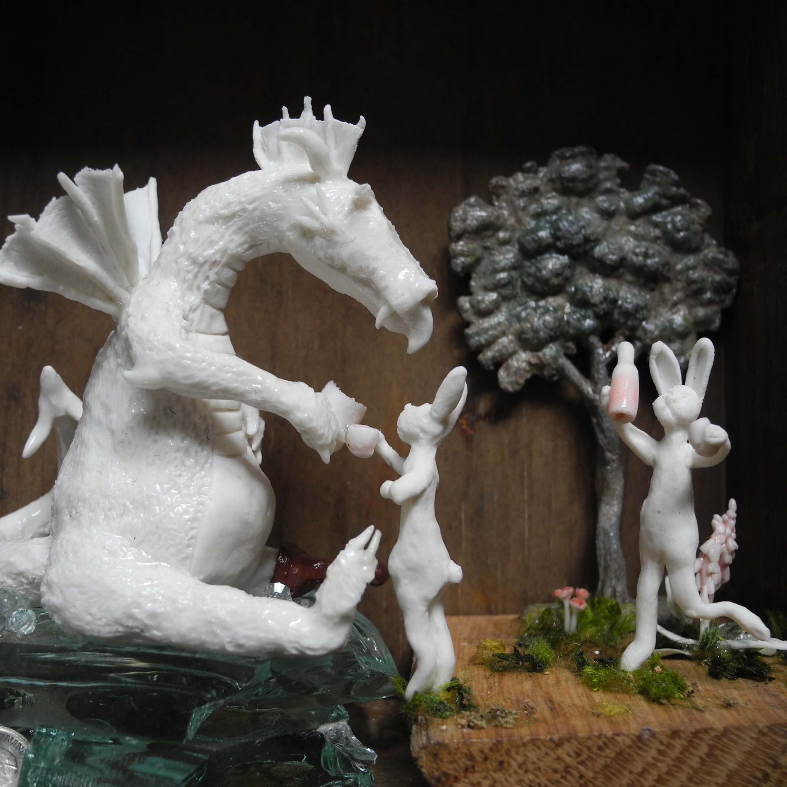 Mixed media piece. In an old solid wood drawer sits a white dragon with a peg leg, don’t ask why or how … Two hares have brought there homemade bottle of goodness and are toasting with the dragon. The white dragon sits on a pile of glass, silvery and pearly items. Among which a “dubbeltje”, a old 10 Dutch cents coin. White dragons are not interested in gold, they hoard everything white, clear or silver coloured. In the background a tree, in lead, protected by a layer of varnish, found when digging in my backyard. Some foxgloves and tulips in porcelain make the scene complete.