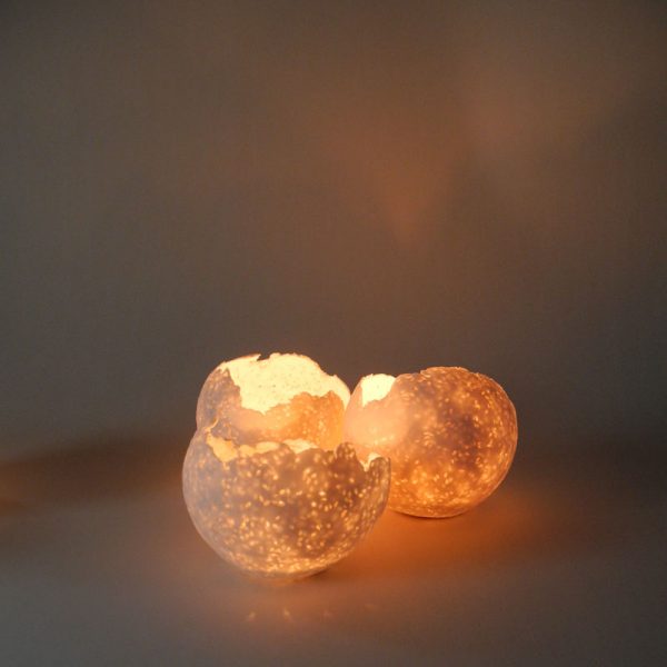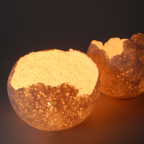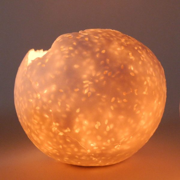 Small moon light – decorative votive candle holder in natural white porcelain. A round shape full of little craters, making it decorative and interesting whether a candle is lit or not. It is roughly the size of a tennis ball.